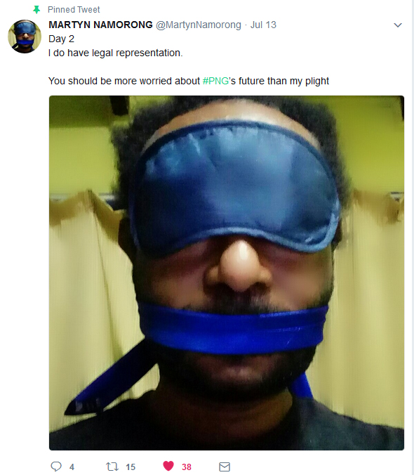 Namorong has vowed to continue posting a gagged image of himself on social media while the gag order remains in effect. This was his image on Day 2 of the gag – and he now has a lawyer.