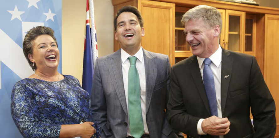 Guess who made the joke? Not Bennett – she has the big laugh for the boss look, not Simon who has the big laugh so I’m still one of the team look. It must be Bill English’s, who is red in the face with relief at having got out before National collapsed with the haha don’t blame it on me look.