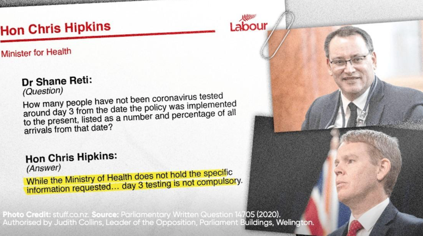 The image, posted to the National Party and some MPs’ social media pages, was made to look like a Labour Party letter and showed a written answer by Hipkins to National’s health spokesperson Dr Shane Reti about COVID-19 testing.