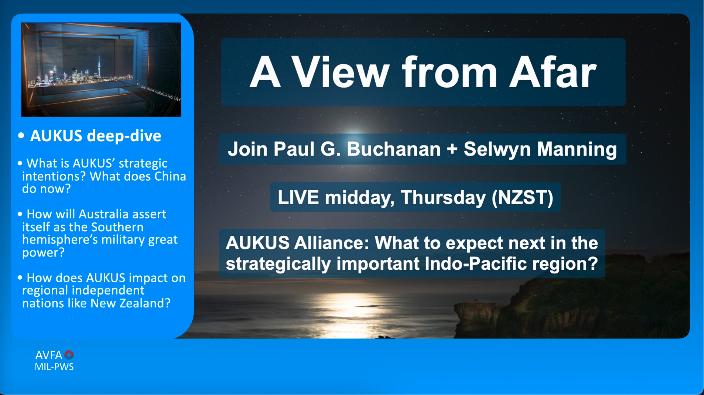 A View from Afar – LIVE POSTPONED UNTIL SEPTEMBER 30 @ MIDDAY: In this podcast, Paul G. Buchanan and Selwyn Manning will analyse the AUKUS Alliance and will deep-dive into: