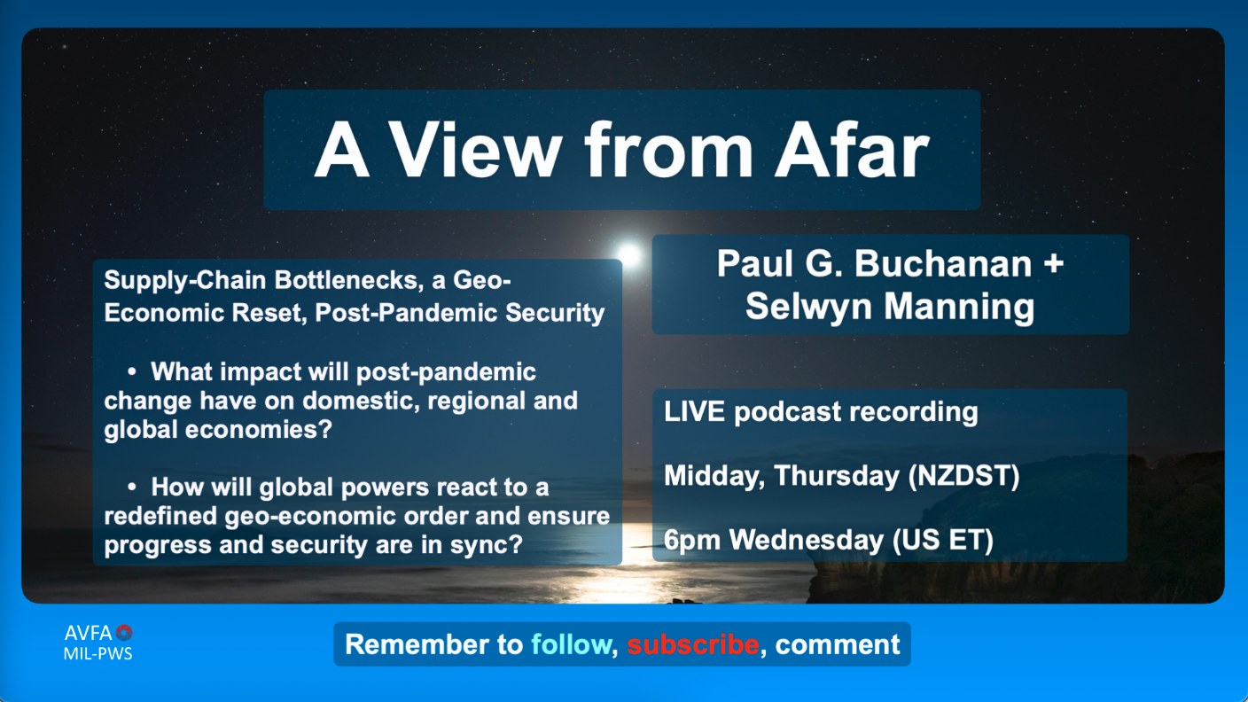 A View from Afar – In this podcast, Paul G. Buchanan and Selwyn Manning analyse how supply-chain bottlenecks, a global economic reset, and post-pandemic security are about to trigger a new era in geo-economics.