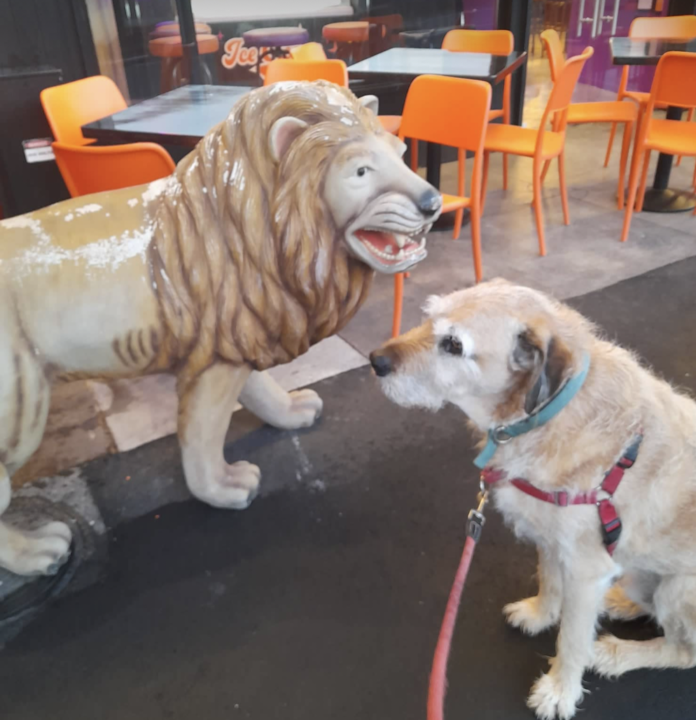 Lion a chipped model. Dog real, on hidden lead. Thinks.. Hmmm – lion, used, old, past its best…lying, sounds like. I wonder if there’s a message there. Must stay alert, with ears