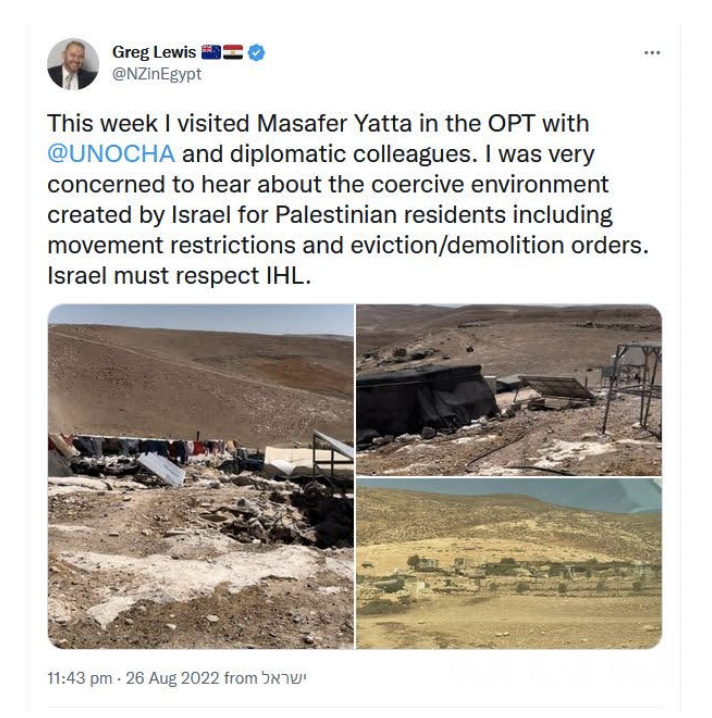 In August last year New Zealand representative to the Occupied Palestinian Territories, Greg Lewis, spoke out supporting the Palestinians facing eviction from Masafer Yatta.