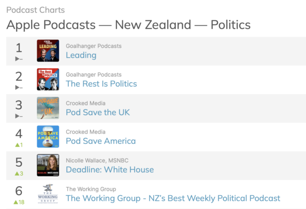 Despite NO funding from NZ on Air, The Working Group just became the top NZ made Weekly Political Podcast in the Apple Podcast Charts!