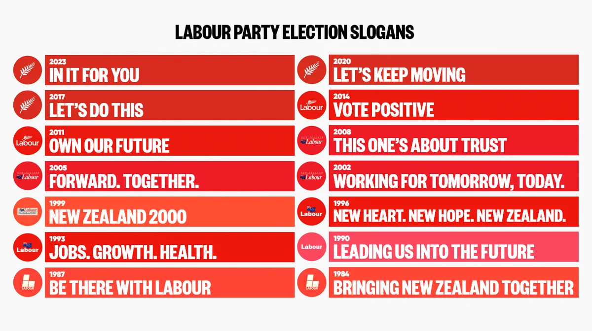 @Tiare_MP on Twitter has compiled previous election slogans from Labour and National and it paints a very clear picture of what they think we are stupid enough to vote for.