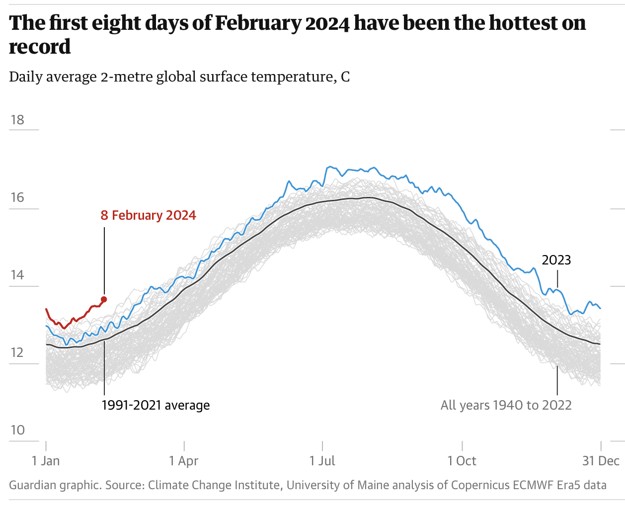 A little over halfway into the shortest month of the year, the heating spike has become so pronounced that climate charts are entering new territory, particularly for sea-surface temperatures that have persisted and accelerated to the point where expert observers are struggling to explain how the change is happening.