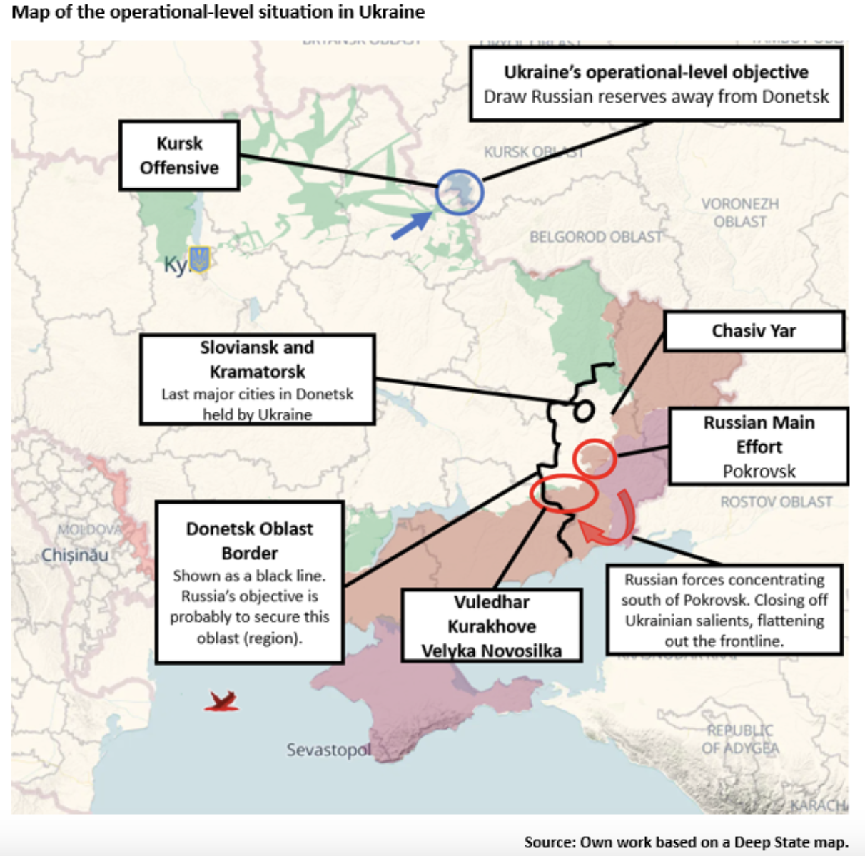 At operational-level the situation remains the same as it has for months. A ‘see saw’ campaign in which both sides try to apply pressure at opposite ends of the frontline. Ukraine in the north near Kursk, and Russia after failing at Chasiv Yar, then at Pokrovsk is now applying pressure further south near Vuledhar, Kurakhove and Velyka Novilisilka.