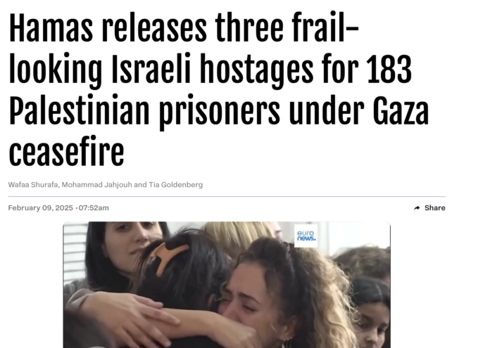 Israel should be surprised that any hostages were fed at all, considering that for the past 16 months it has done its best to prevent any food from getting into Gaza. Does Jewish exceptionalism require that Israeli hostages are fed three square meals a day while Palestinian infants are starving to death? Perhaps. But aside from the governments of Israel, the US and New Zealand, the world will have no difficulty seeing that the condition of Israeli prisoners is wholly the work of the State of Israel and its allies.
