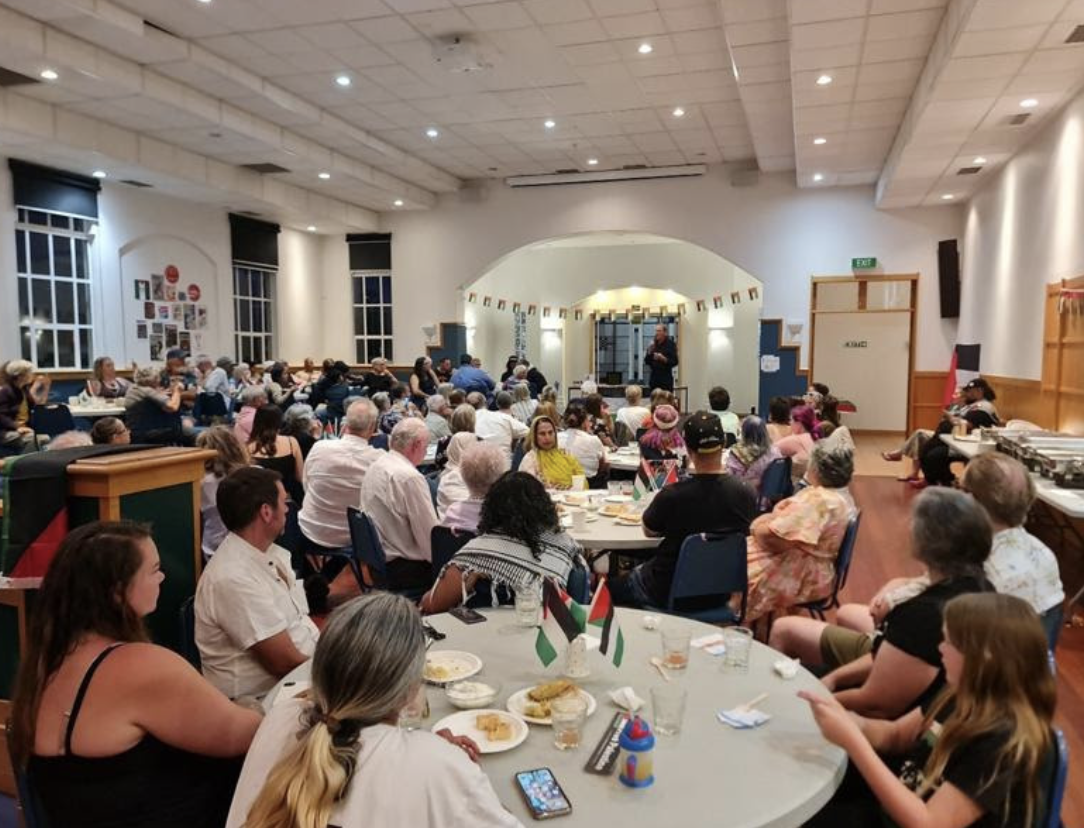 Last weekend PSNA National Chair John Minto attended two rallies in Hawkes Bay – Napier and Hastings – and also spoke at a fundraising dinner for Palestine at the Taradale Town Hall (pictured)