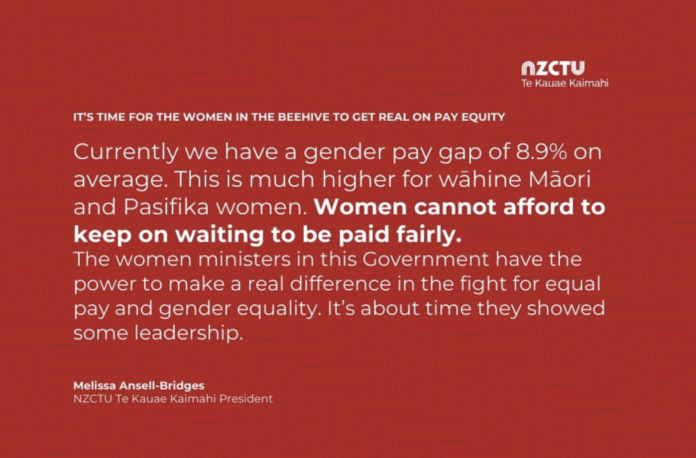 “Currently we have a gender pay gap of 8.9% on average. This is much higher for wāhine Māori (16.2%) and Pasifika women (21.2%). Women cannot afford to keep on waiting to be paid fairly.