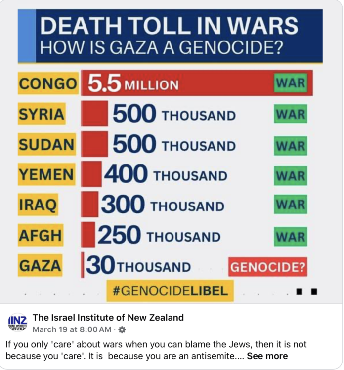 IINZ list the much larger death tolls committed in other atrocities and wars, to smear those opposed to the genocide in Gaza as hypocrites and anti-Semites because we allegedly didn’t oppose those other wars and atrocities, when in fact New Zealanders have a proud history of opposing these wars and atrocities, often in large numbers protesting on the streets of this country.