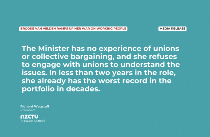 “In yet another announcement from Brooke van Velden, workers’ rights are being eroded and unions undermined,” said NZCTU President Richard Wagstaff.