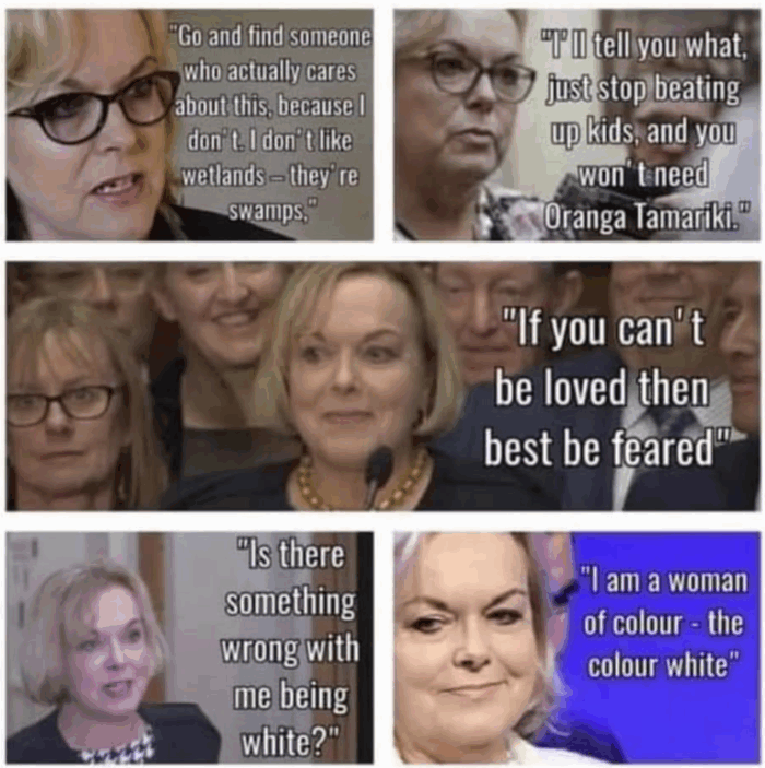 Luxon because he has shown no comprehension what he is allowing to manifest by letting the Treaty Principles Referendum advance as far as it did, and Judith Collins for bringing a punishment that was almost Israeli level disproportionality.