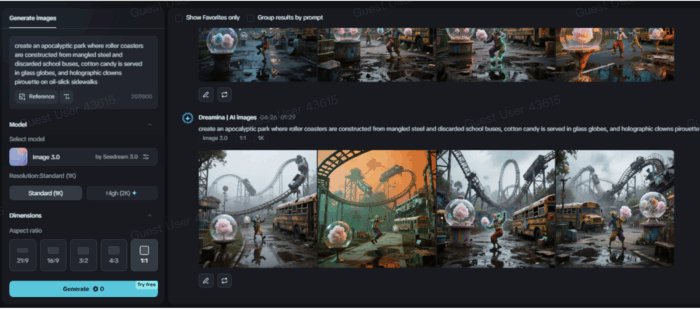 For instance, attempt something similar to: “A sunset post-apocalyptic carnival, roller coasters made of scrap metal, holographic clowns that glow, rusted Ferris wheel, neon lights reflecting off cracked asphalt, desert landscape, dystopian cyberpunk aesthetics.” The prompt instructs Dreamina to merge dirty realism with fantastical sci-fi expression, resulting in a carnival that’s haunting and hypnotic.
