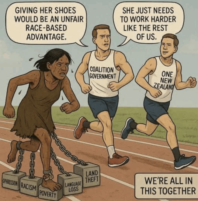 What would make the point thoroughly? Some white person hobbling along behind the dark one holding up one of the ankle blocks perhaps. The oppression one, as Maori and Pacific Islanders have had the great burden of all the others (Maori women have tended to show at the bottom of wage and conditions studies).