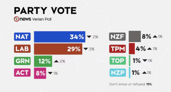 RNZ Reid poll today has Labour ahead of Natzos 33-30%, and TPM on 5.5%-over threshold, with Lab, Green TPM on 63 seats able to form a Government.