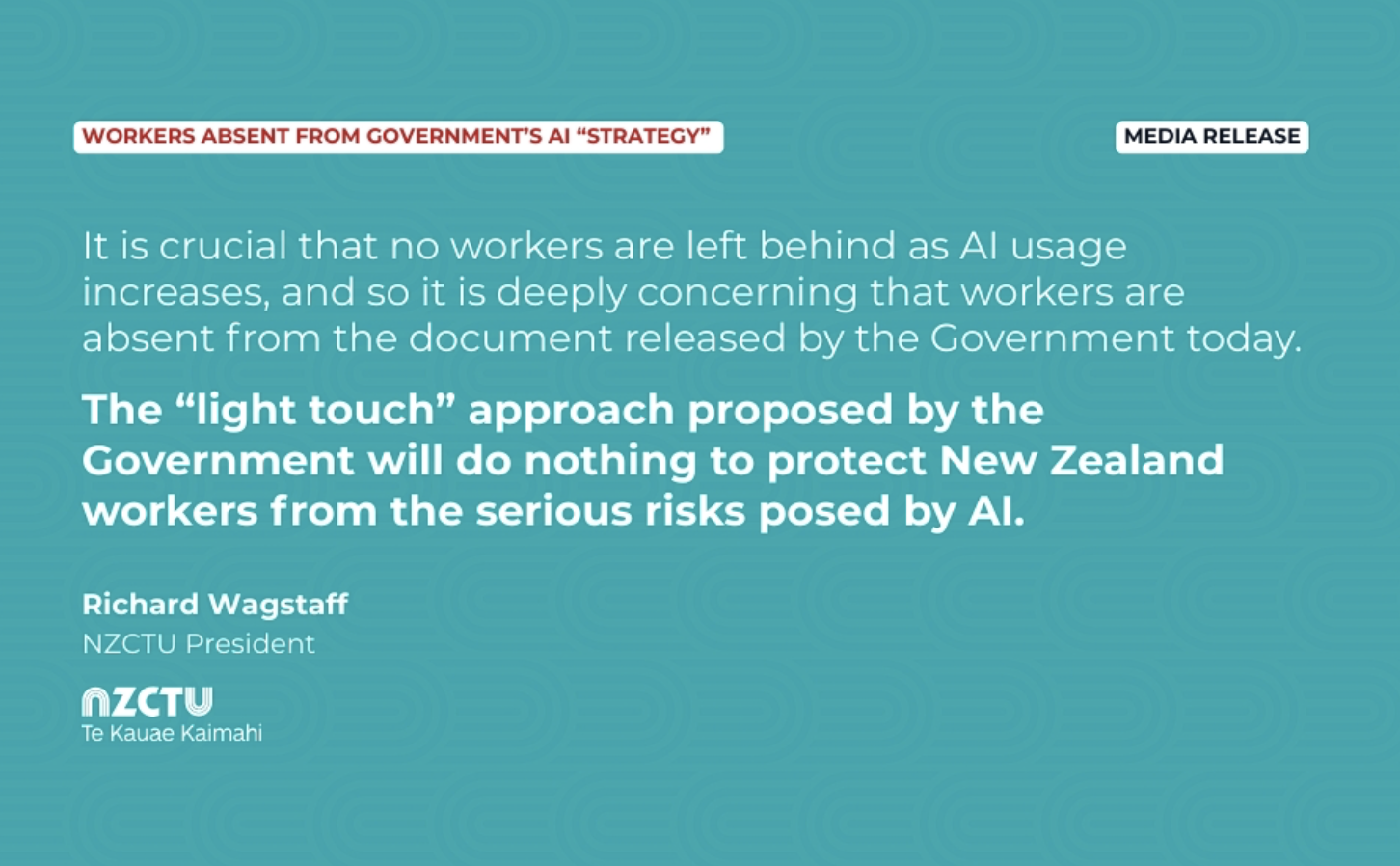 “It is crucial that no workers are left behind as AI usage increases, and so it is deeply concerning that workers are absent from the document released by the Government today,” said NZCTU President Richard Wagstaff.