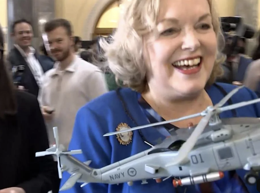 Defence Minister Judith Collins carried a model Seahawk helicopter and a huge grin with her on Thursday, as she headed to the debating chamber.