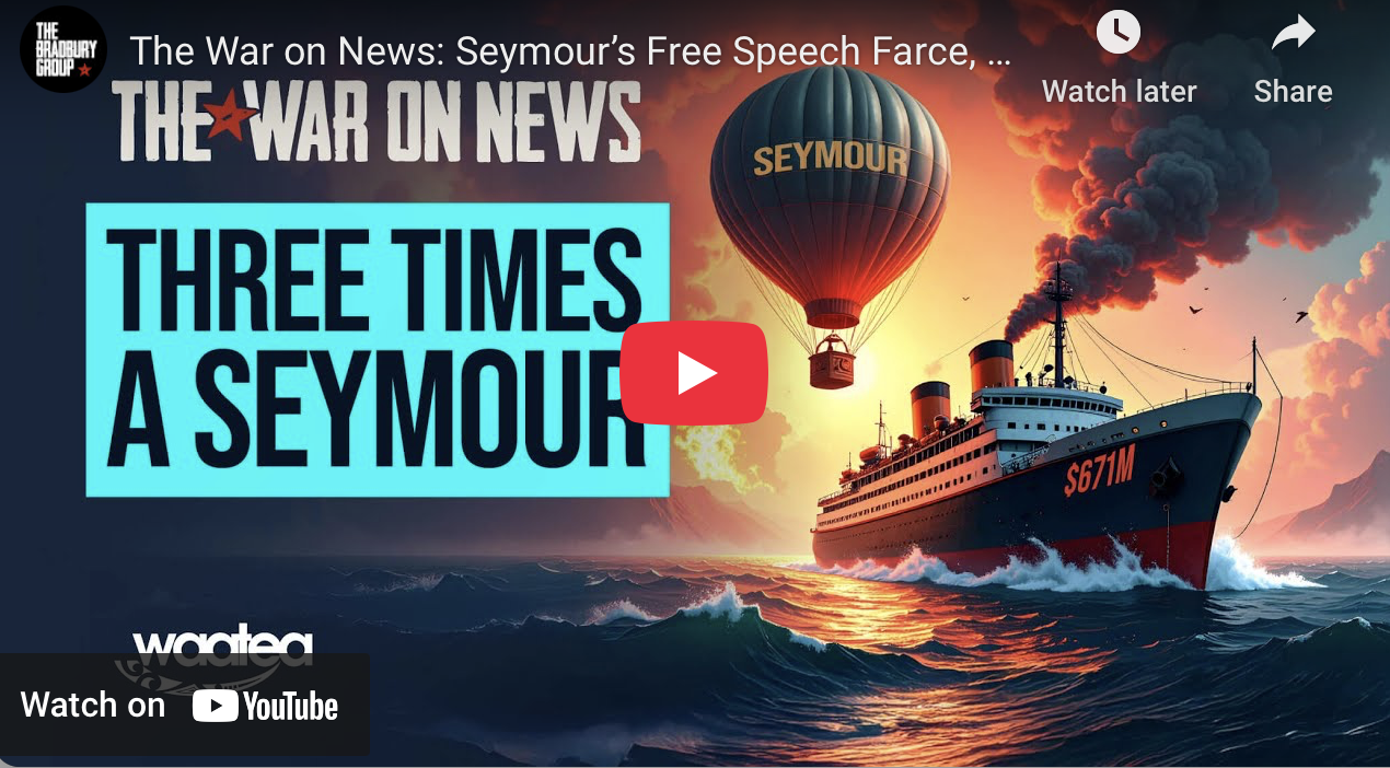This week on The War on News, Martyn Bradbury rips into the theatre of the absurd — starring David Seymour, a missing ferry, and the slow-motion disaster of climate capitalism. 🎭 Three Times a Seymour: David Seymour achieved the rare trifecta of pratdom this week — mocking Chlöe Swarbrick’s stand for Gaza as “peak theatrics,” attacking churches for defending Māori wards, and calling for a review of bike helmet laws because apparently the free market should decide how many concussions you’re allowed. David, who once drove a Jeep up Parliament’s steps, is now lecturing others on political performance. Free speech for me, but not for thee. 🚢 $671 Million and Still No Ferry: Late Friday, the government quietly dropped the full cost of scrapping the iRex ferries: $671 million… for nothing. Nicola Willis has turned public transport into a fairy tale — except instead of magic beans, we got no boat, no plan, and a very expensive lesson in how not to govern. 🔥 The $5 Trillion Climate Tab: A new report from Lloyd’s and the Cambridge Centre for Risk Studies says even the least-worst impacts of extreme weather will cost the world $5 trillion over 40 years. That’s the best case scenario. And yet, the pro-industrial complex keeps selling denial while the world catches fire. The week’s news — boiled, battered, and served back with bite. It’s not news. It’s the War on News.