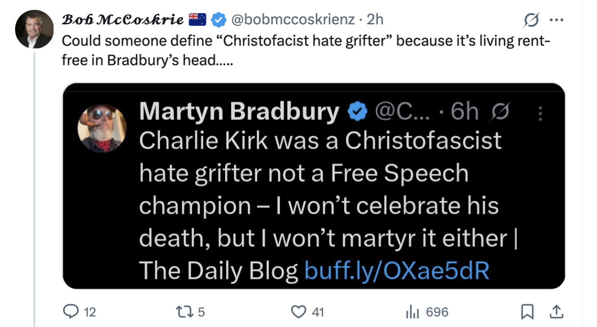 Yes as a Christofascist pretty sure Bob would like to debate this and also how Kirk was killed by some guy from his own quarter – the killer brought up as he was in a white gun loving Trumpist family. Guns are so normalised in America, perhaps they might just begin to think they need a culture shift … or it’s live by the sword die by the sword. Happened here.