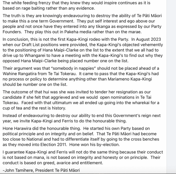 Bad bad. And what about Kaipara? She is in with Frerris and Kapa kingi too, with her endorsement of Kapa kingi. So stupid and disloyal to the people who voted for her. Agree with every single word Tamahiri wrote especially the last sentence. This is not the time of a coup. If they don’t leave they need to be expelled. Why did they bother even being part of TPM, they should have gone independent instead they are like snakes in the grass. Greedy egoistic and fucking stupid. Do their electorates support them? If they do they shouldn’t because they really do not care about their electorates, only themselves.