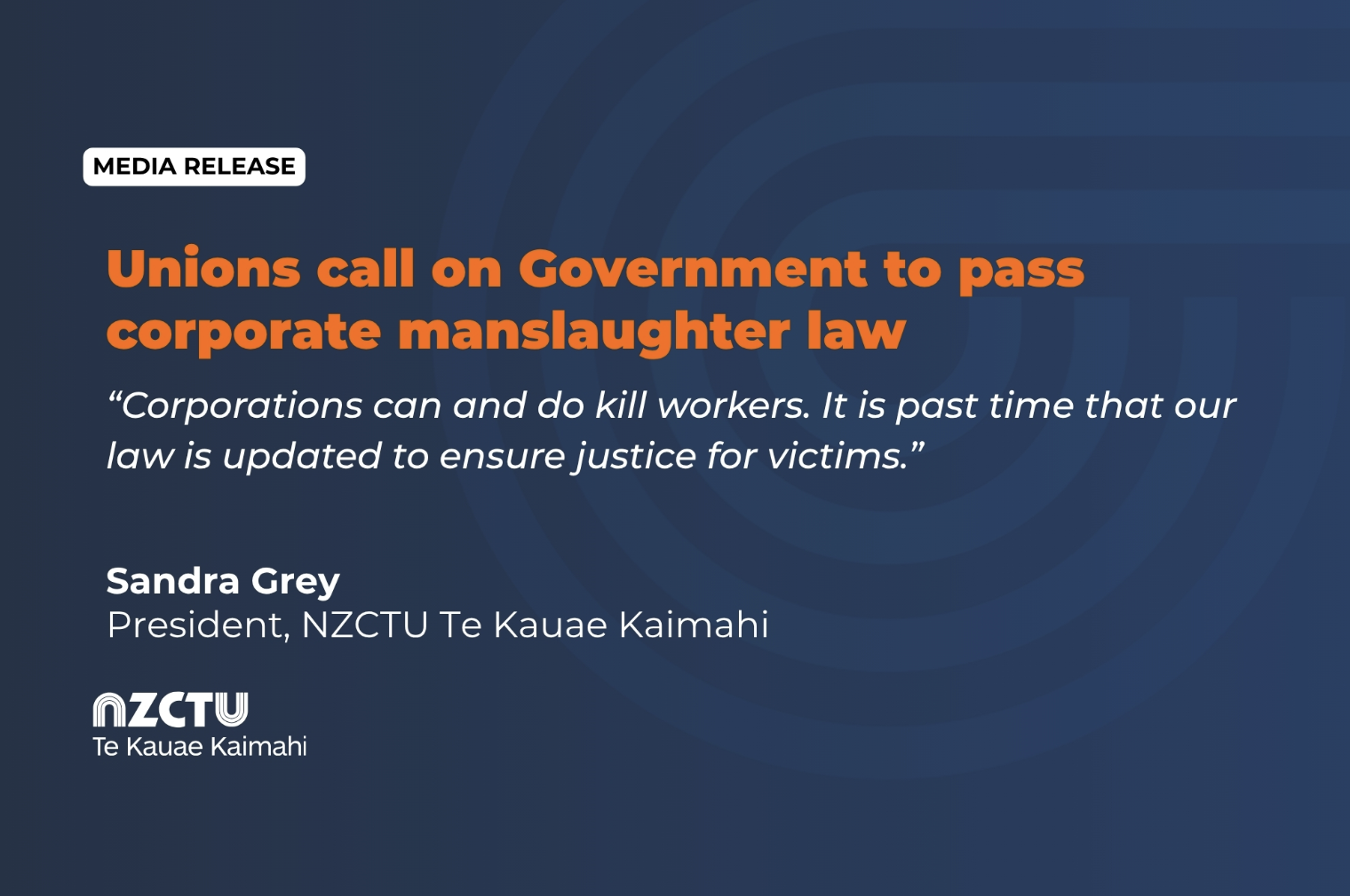 “Corporations should not be above the law. If they are responsible for workplace deaths, they must be held criminally liable,” said NZCTU President Sandra Grey.