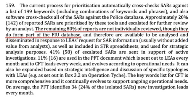This is why it was distressing to read in New Zealand’s FATF Mutual Evaluation Report 2021 (FATF NZ MER 2021) that the NZ Police FIU are only examining 20% of Suspicious Activity Reports that New Zealand’s business community is sending to the NZ Police FIU on concerns and reporting suspicions of terrorism financing or money laundering. Paragraph 159 (figure 3 below) of the FATF NZ MER 2021 is extracted and copied below. The paragraph is referring to Suspicious Activity Reports that the business community submit to the NZ Police FIU and confirms that 80% of Suspicious Activity Reports (SARs) are not individually reviewed: