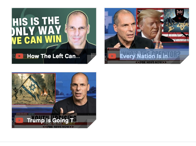 While the first link below presents respected economist, Yanis Varoufakis, explaining his thoughts on how the left can unite to combat neoliberalism, the following six links, though they appear to be him speaking on a range of other topics, have been compiled from a library of his earlier statements, set to an AI-animated image and voice facsimile.