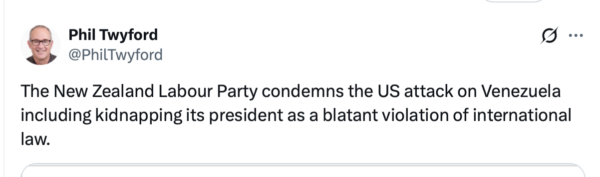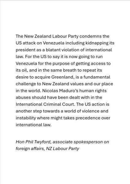 Well done Labour for stepping up and condemning the illegality of Trump’s actions against Venezuela. Now we want more, so think seriously about doing the same with Palestine. That situation is so appalling and totally out of control. Why hasn’t an International Court arrested the monster Netanyahu and narcissist Trump? So where is Luxon? Today it appears he is in Auckland announcing the conclusion of his FTA with India; now will we finally get FULL DETAILS or more ‘pie in the sky’? He must comprehend that few NZ’ers trust his motives or honesty. He is as corrupt as the rest of his mob so will be selling our souls down the river! We DON’T NEED more IMMIGRANTS โ we already can’t provide jobs for our own homegrown people!!!!! And thanks again media – when Millie Holmes is a prime focus you have really lost the plot!