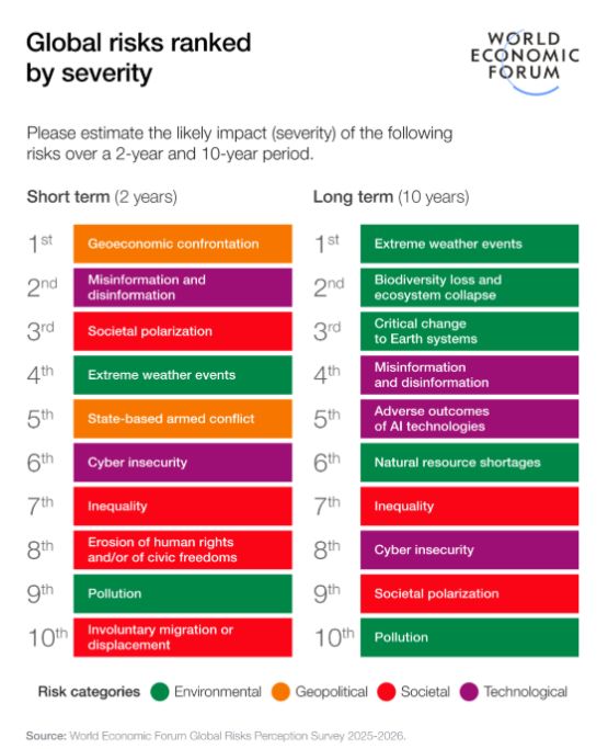 The report analyses risks across three timeframes: immediate (2026); short-to-medium term (the next two years); and long term (the next 10 years). In the near term, armed conflict, the weaponization of economic tools and societal fragmentation are colliding. As these immediate risks intensify, longer-term challenges from technological acceleration to environmental decline are also creating knock-on effects.