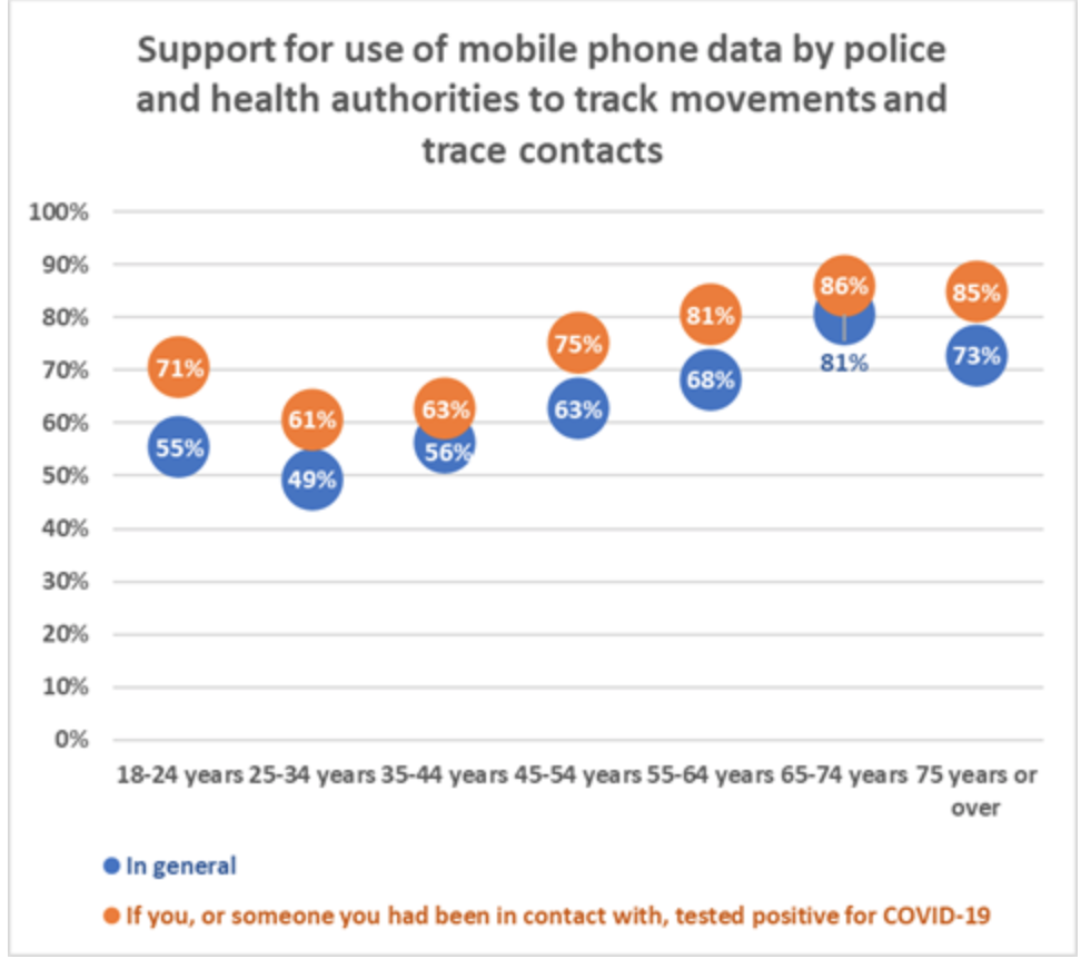 However, this rises to 73% when asked if they would support police and health authorities using data from their own mobile phone to help track and trace those who have come in contact with people who have COVID.