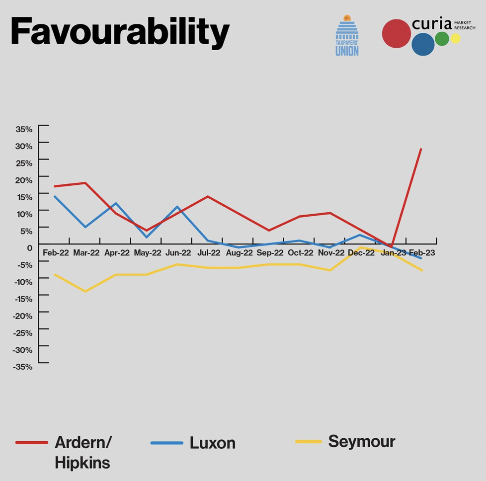 Hipkins has done extraordinarily well since he took over. Sure, some of it is due to the typical ‘bump’ of favorability associated with a fresh face, but in addition to that he has begun to steer Labour back on to the track and out of the weeds. He’s looking a lot more like Mike Moore or Tony Blair than Ardern right now. (Sigh of relief!)