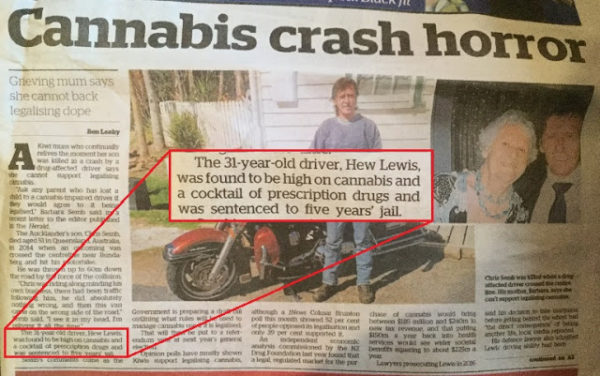I mean, seriously. Take a look at this story, from the front-page of yesterday’s NZ Herald. Now, going off that headline … and pretty much everything else in the article … you’d be forgiven for thinking that cannabis was the *only* factor [or, indeed *a* substantive, salient factor] in the accident that occurred. Because it’s repeated – over and over and over again, for two pages.