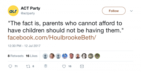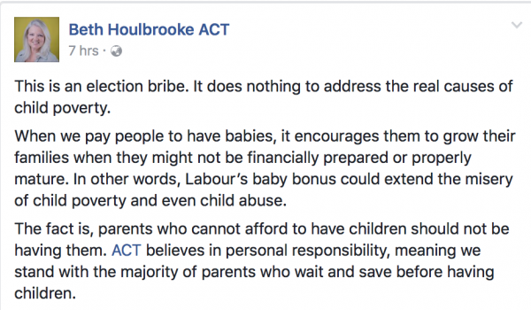 Why don’t ACT just say it straight – we don’t want the poor, feckless, brown, filthy, unemployed, and probably unintelligent to breed. Why can’t they afford to raise children Beth – because they can’t earn enough or find suitable jobs in this neoliberal disaster of an economy