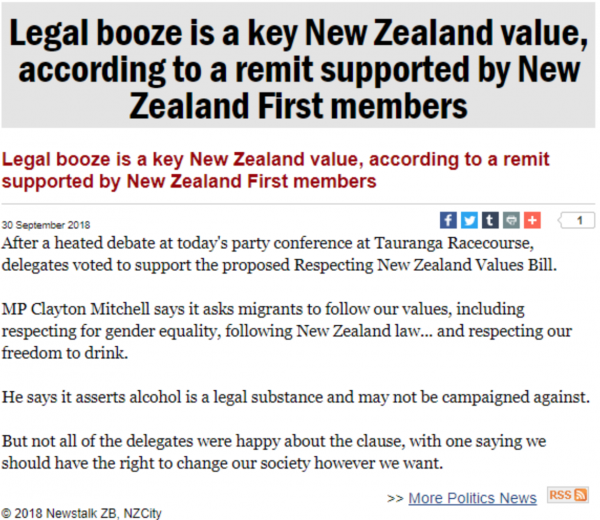 Now, before I continue, I should probably clarify that I was nowhere near this year’s NZ First Convention – so I am simply relying upon the several media pieces mentioning it. If this rather curious statement that the apparently sacrosanct legal availability of alcohol be declared an inviolable New Zealand value did *not* in fact take place, then I of course withdraw and apologize.