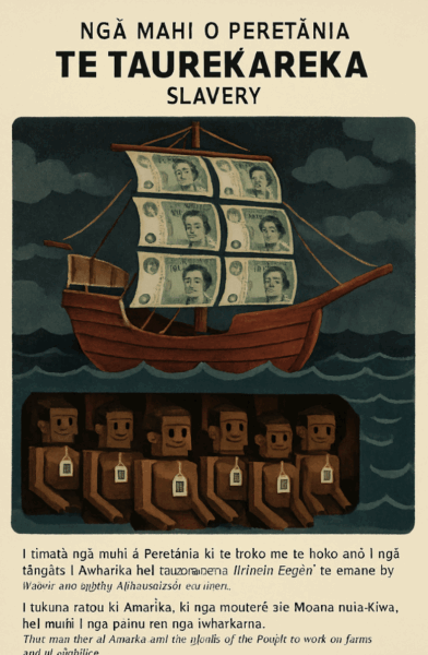 Visual: A puppet ship sails across a stormy Atlantic, its sails stitched from pound notes. Below deck, puppet figures are stacked like cargo, each tagged with a barcode. Text (Te Reo Māori):