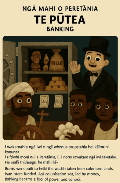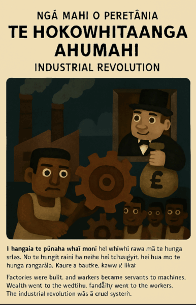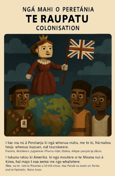 “Absolutely, Tim. Let’s build a six-page illustrated school book in Te Reo Māori that charts the arc of British history through the lens of slavery, colonisation, exploitation, banking, capitalism, and the industrial revolution—each page pairing bilingual text with bold, satirical visuals. I’ll keep the tone educational but pointed, with room to escalate into puppet parody or genre remixing if you want.”