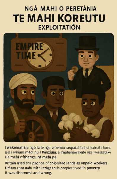 Visual: Puppet workers in India and Africa toil under giant clocks labeled “Empire Time,” while a puppet banker counts coins in a top hat. Text (Te Reo Māori):