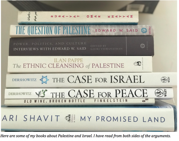 The reason I am telling you all this, is to say that I have adopted the same approach to the Palestinian and Israeli issue. I have familiarized myself with the arguments on both sides and have formed my opinion accordingly.