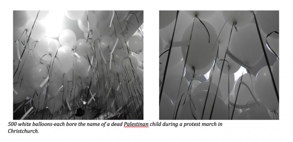 500 white balloons-each bore the name of a dead Palestinan child during a protest march in Christchurch.