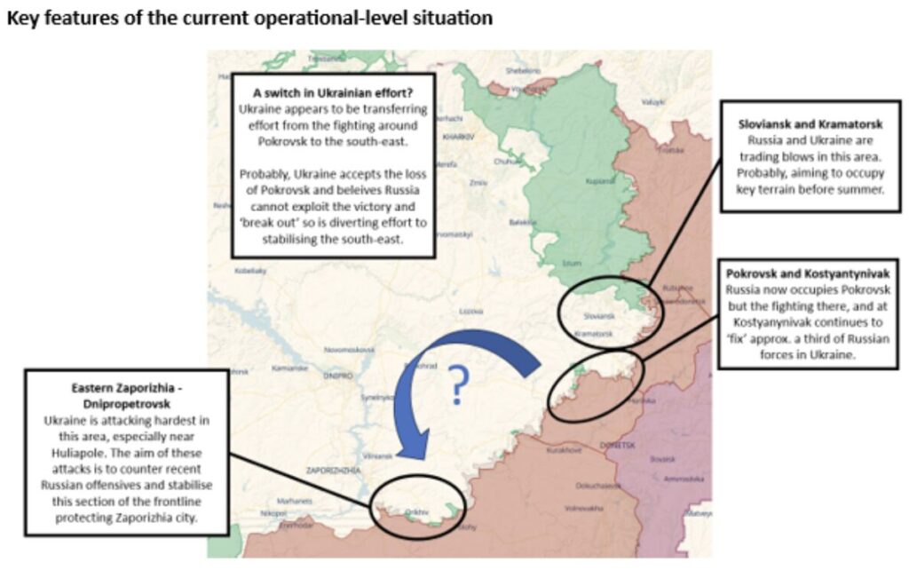 Ukraine’s gains in the south-west are relatively small, approx. 300 square kilometres according to a recent statement by Ukraine’s president. At this stage, the operation is probably aimed at taking advantage of Russia’s communications trouble to re-shuffle the frontline and strengthen defences before summer. My assessment is that Ukraine is using Pokrovsk, Myrnohrad and Kostyantynivka to ‘fix’ Russian forces in place so they can divert resource to strengthen other parts of the frontline.