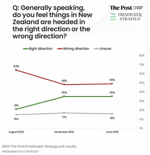 Labour has pulled ahead of National in the latest The Post/Freshwater Strategy poll, as nearly half of New Zealanders say the country is heading in the wrong direction and cost-of-living concerns continue to dominate public sentiment.