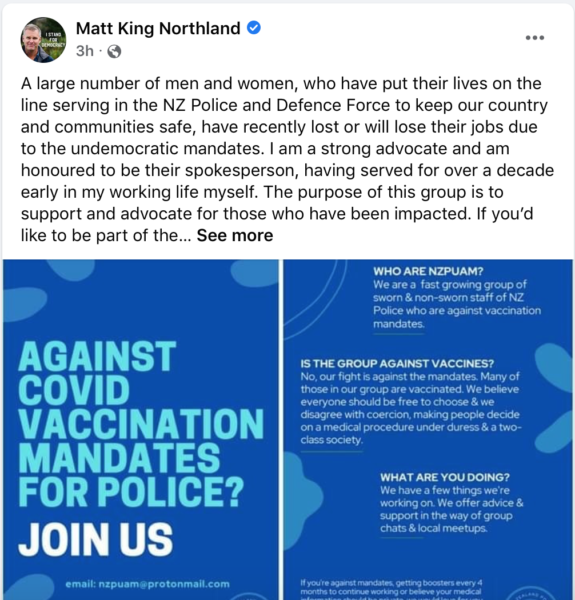 A new splinter group of AntiVaxxers have formed inside the NZ Police and National candidate Matt King is promoting this on his Facebook page…