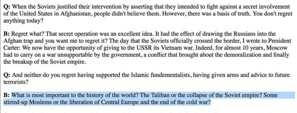 This was what he said in 1998 to justify handing Islamic extremists huge amounts of weapons to fight the Soviets in the 1980s –