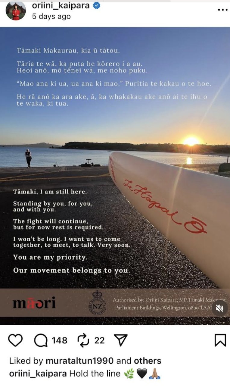 This is Tāmaki Makaurau MP Oriini Kaipara posting on Instagram…