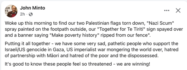 It says a great deal about the moron who did this, it wasn’t just about Minto’s views on the IDF and their treacherous government, it is about Te Tiriti and about making poverty history. Basically some right wing idiot.