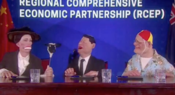 “Jinping and me, Jinping and me, what won’t he buy? So sorry to the Uighurs, we turned a blind eye,” Ardern and Morrison sing in unison.