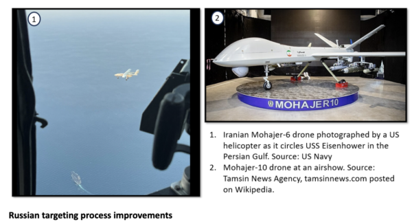 The second observation is that to-date Russian drones have not demonstrated the ability to guide long-range missiles onto targets. A technically difficult capability that requires relatively large drones that can mount laser designators, can maintain digital communications and are connected to the GPS network. In late 2022, there were reports of Russia using Iranian, Mohajer-6 drones to guide attacks by suicide drones but since then there has been little evidence of deep strikes using this method of attack. Some in the military blogging community are speculating that these attacks are evidence of more Mohajer-6 drones being in service or of newer and more sophisticated Mohajer-10 drones being deployed in Ukraine. However, at this stage deployment of newer more sophisticated drones has not been confirmed.