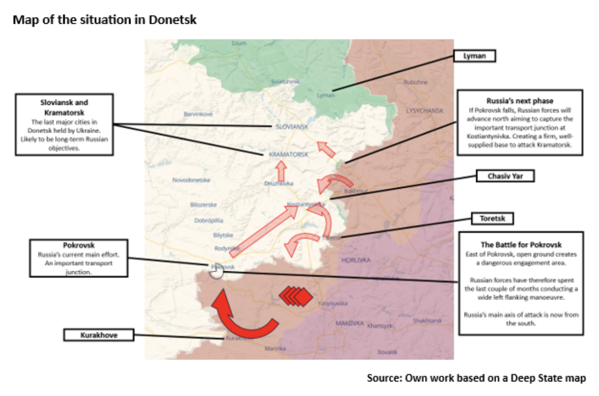 Russia’s main effort continues to be Pokrovsk, their aim is to capture the city and dominate transport route through area, and create base from which to campaign for control of the remainder of Donbas. Pokrovsk is near a set of important road and rail connections, and sits on high ground that dominates a large area, so it is a useful stepping stone on the path to capturing the cities of Sloviansk and Kramatorsk.