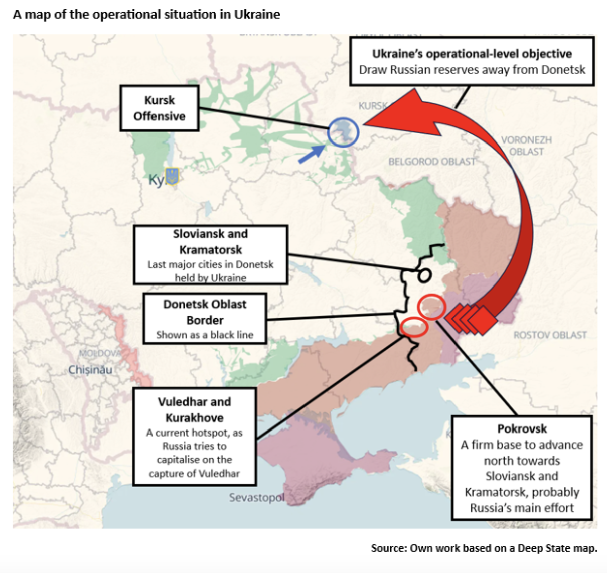 - The election has not changed the overall structure of the campaign. The protagonists are still engaged in a large ‘turning movement,’ Russia focussed on the east, specifically the capture of Donetsk. Ukraine, holding the line in the east inflicting attrition while it tries to draw Russian forces away from Donetsk, by attacking into Kursk.